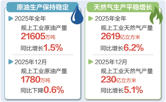 中国石油网综合消息 1月19日,国家统计局发布2025年12月能源生产情况,规模以上工业(简称规上工业)原油生产保持稳定,天然气生产平稳增长。