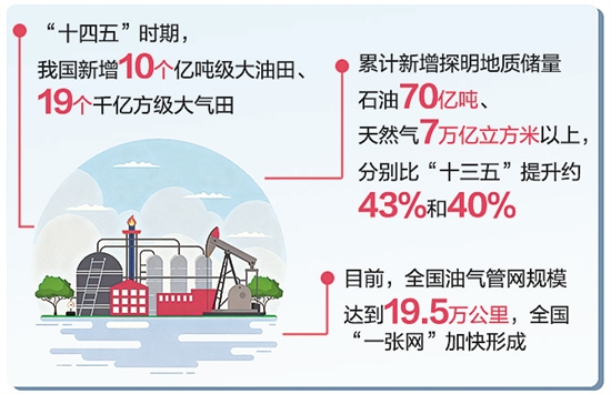 “十四五”期间,我国石油天然气勘探成果丰硕,产量稳中有增,推动我国油气生产进入量效齐增与绿色开发新阶段。我国新增10个亿吨级大油田、19个千亿方级大气田。累计新增探明地质储量石油70亿吨、天然气7万亿立方米以上,分别比“十三五”提升约43%和40%。目前,全国油气管网规模达到19.5万公里,全国“一张网”加快形成。