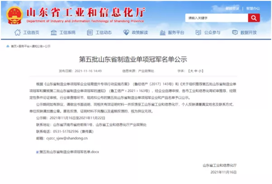 11月16日,山东省工业和信息化厅网站公布了第五批山东省制造业单项冠军企业(产品)名单,东营市三和石油装备有限公司成功入选第五批制造业单项冠军企业,德仕能源科技集团股份有限公司的原油降凝剂成功入选第五批制造业单项冠军产品。